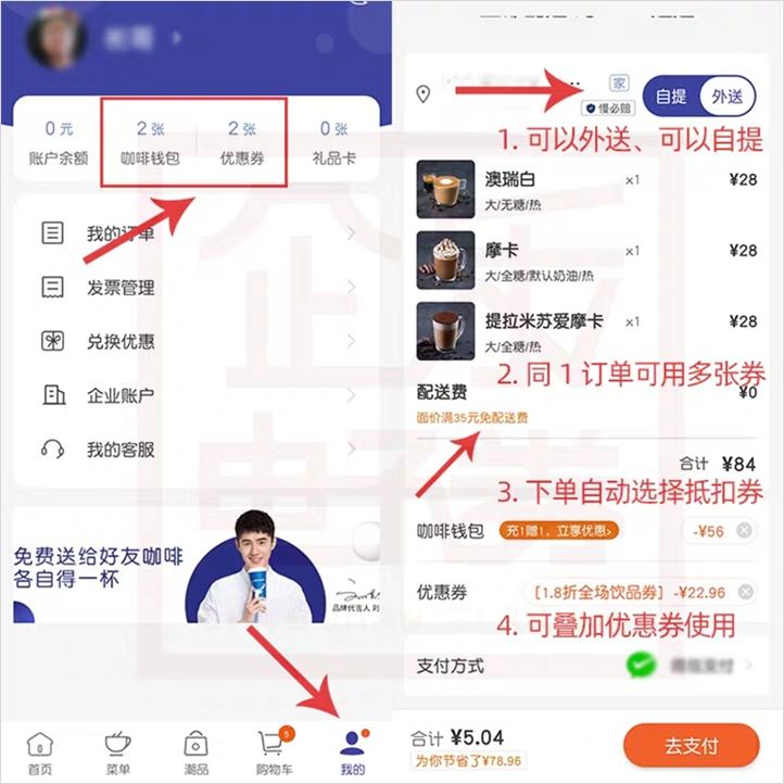 比如, 3 杯 84 元的咖啡,通过叠加优惠券只需要支付 5 元。