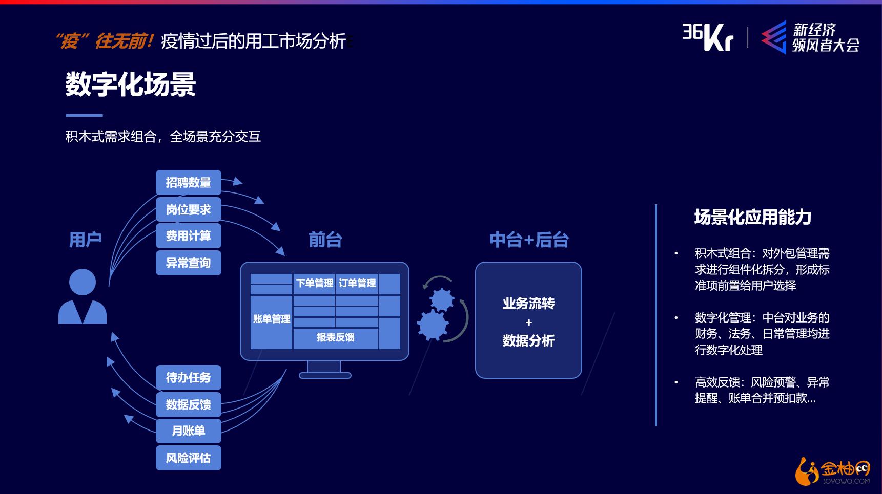 疫情之后,一定有很大一波企业会进行爆发,爆发的过程中会产生大量的全国性的业务诉求,这些诉求就需要匹配相应的资源去招聘、管理,然后把风险控制在一定的程度内同时降低成本,这些都是会通过和第三方的协作。通过AI技术和数据化平台的整合,将业务需求变成所有业务的数据,这些业务要网络化、平台智能化才能实现,这些是金柚网目前在做的事情。