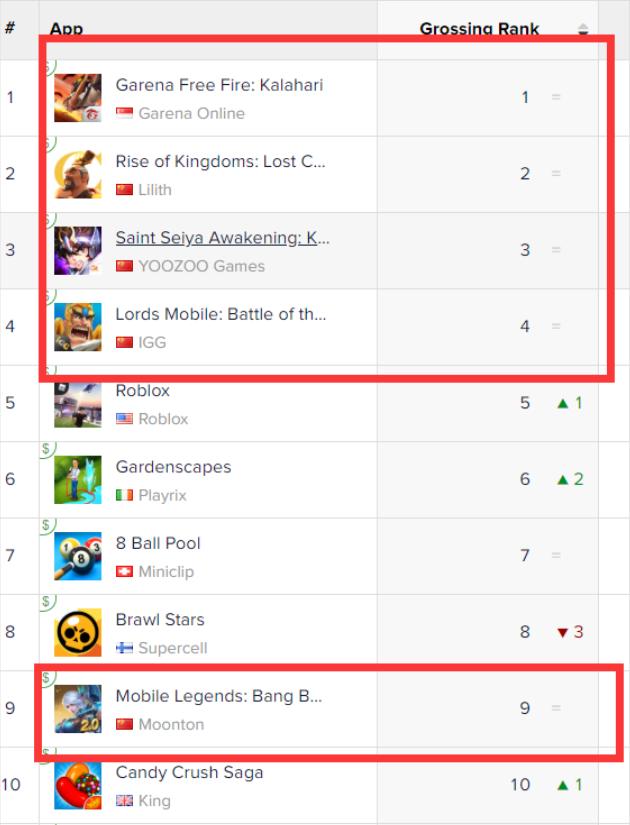 在App Annie最新的巴西游戏收入榜单中,前四名都是中国公司开发的游戏,像Garena的Free Fire、莉莉丝的万国觉醒、游族的圣斗士星矢、IGG的王国纪元、沐瞳的Mobile Legends,排名都很靠前。