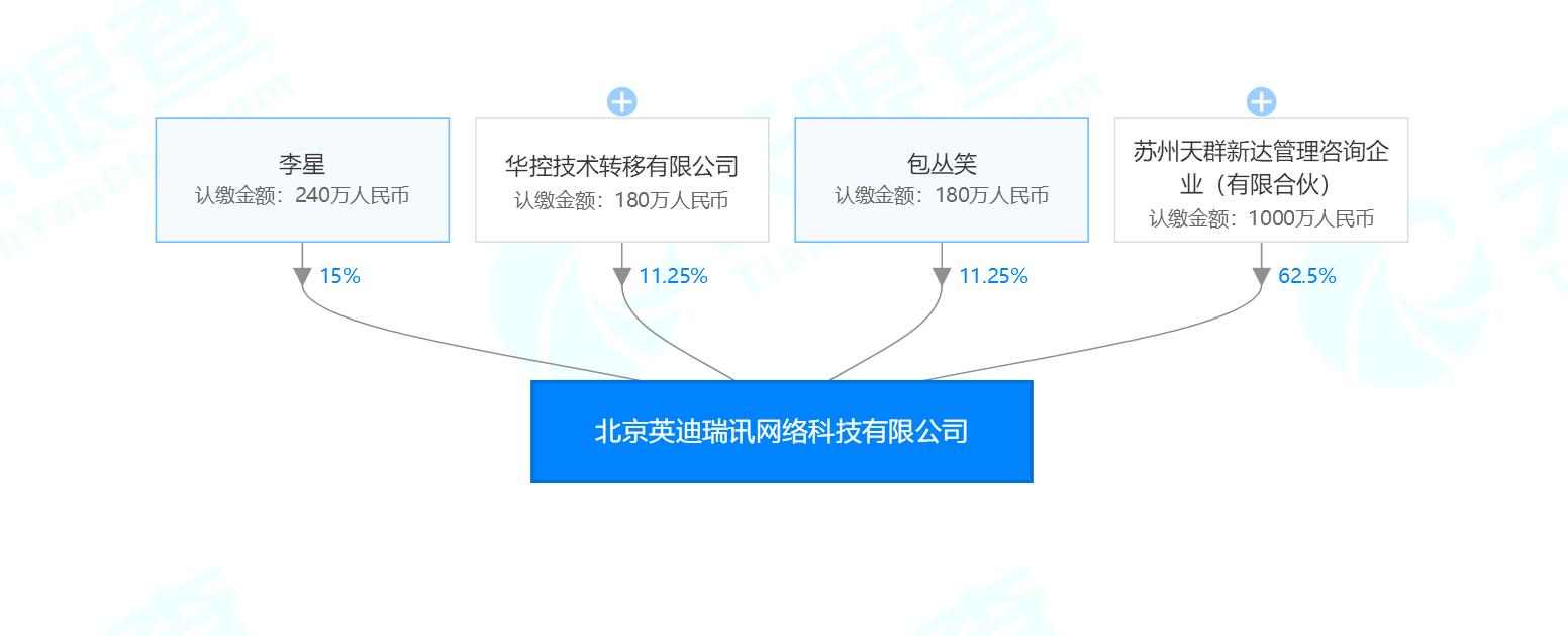天眼查公开信息显示,冯昕任董事长和总经理,注册资本为1600万人民币,由清华大学入股并由专业团队运营,目前暂时无公开的融资信息披露。最大股东为苏州天群新达管理咨询企业,股份份额过半,持股62.5%,董事李星持股15%,为第二大股东;华控技术转移有限公司和董事包丛笑持股11.25%。其中,华控技术由清华技术100%控股。