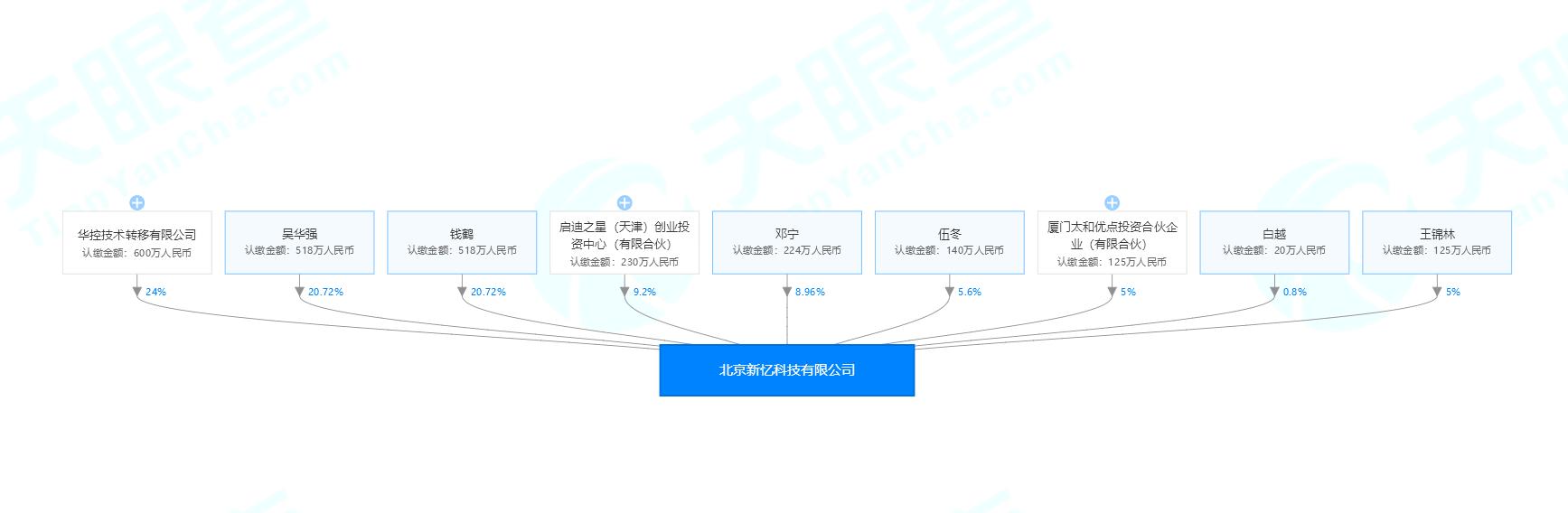 天眼查公开信息显示,「新忆科技」法定代表人为王坤,注册资本为2500万人民币,曾在2018年11月完成了由启迪之星、清华控股领投的天使轮融资,但具体金额未公开披露。股权穿透图显示,公司第一大股东为华控技术转移有限公司,持股24%;吴华强和钱鹤各持股20.72%;天使轮投资的领投方启迪之星持股9.2%。其中,华控技术由清华技术100%控股。