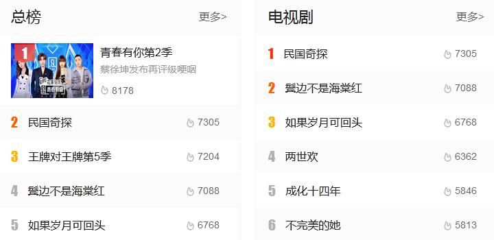 在全网和爱奇艺站内,去年就因《陈情令》火爆而提前拥有姓名(甚至连cp名都提前起好了)的两名“2020耽改种子选手”,热度表现都相对平庸。甚至屡屡被无IP的纯网剧《民国奇探》反超——要说这部剧吧,虽然两个长腿帅哥的互动也令部分观众嗑得欲仙欲死,但它确实不是耽美。