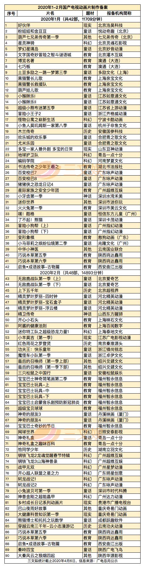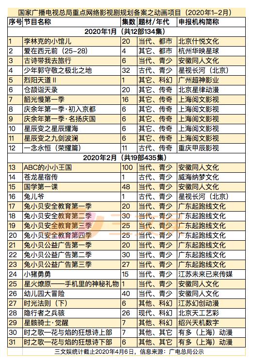 国家广播电视总局最近也公示了2020年1月和2月的国产电视动画片制作备案、2020年1月和2月全国重点网络影视剧拍摄规划登记备案情况,国家电影局发布了截止到2019年11月中旬的全国电影剧本(梗概)备案、立项公示。