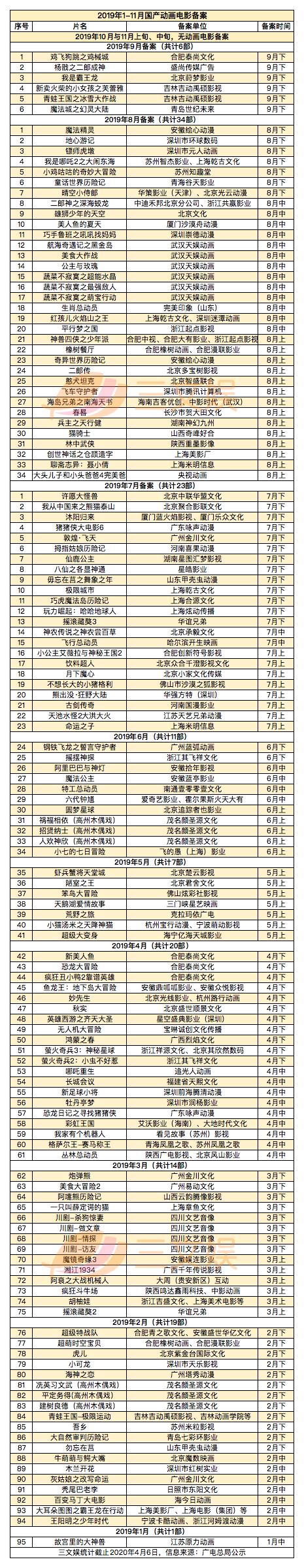 2019年二三四季度全国重点网络影视剧之动画项目上线备案登记情况