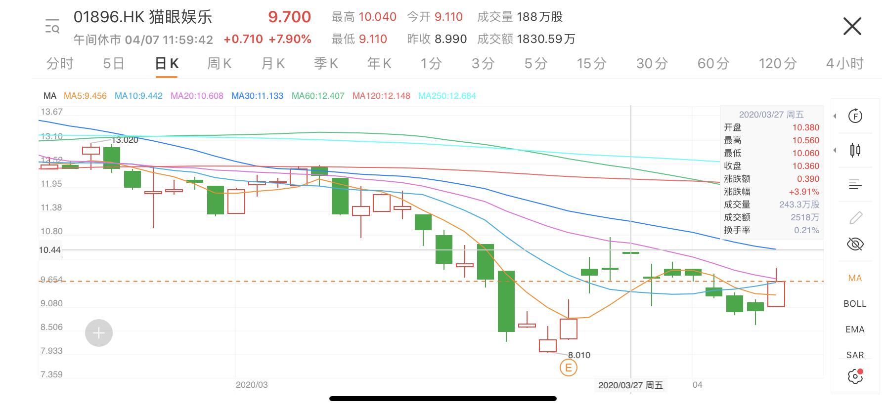 4月7日港股午盘,猫眼娱乐(1896.HK)股价报9.70港元/股,涨幅达7.9%,收获一周以来的最大交易涨幅。自3月27日影院复工被叫停至4月6日,猫眼娱乐股价累计跌幅已超过10%。