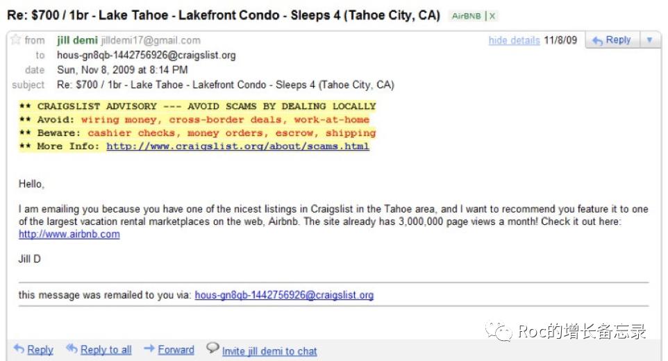 从供给端来看,Airbnb在早期为了节省成本,在供给端通过非常规的技术手段从Craiglist(美国版的58同城)上,获得大量长租房东的邮箱信息,通过给房东群发邮件获得了的第一波供给。这也成为后面在增长界广泛流传的一个经典增长黑客故事(growth hacking),邮件里带给房东的核心价值也很明确,每个月能够让房东多赚500美金,另外操作也极其简单,仅需一个点击,就能把房源信息直接发布到airbnb上。