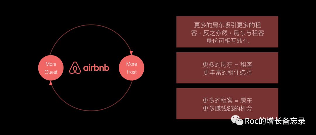 Airbnb如何实现它的网络效应,还是要回到网络效应的基本原理,每增加一个新用户会给网络中的任何其他一个用户增加价值,airbnb的平台则是每一个新增客户都给房东带来潜在的赚钱机会,而每一个房东的增加会给租客带来更多的选择,任意一端的增长都能增强另一端的增长。