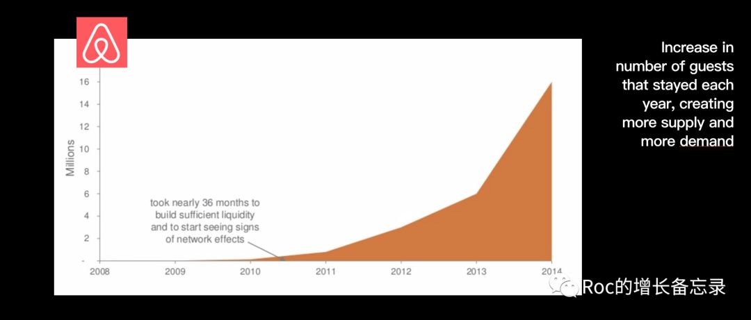 airbnb在前36个月时间里,找到和验证了产品价值之后,都属于一个在像向网络效应临界点冲刺的过程,不断的积累房源,不断的积累客户,重复着这个循环,这个过程是漫长且黑暗的,大多数初创公司因为熬不下去就倒下了。但在这时候,对于任何新进入者,都会看到airbnb竖起的这道极深的护城河。