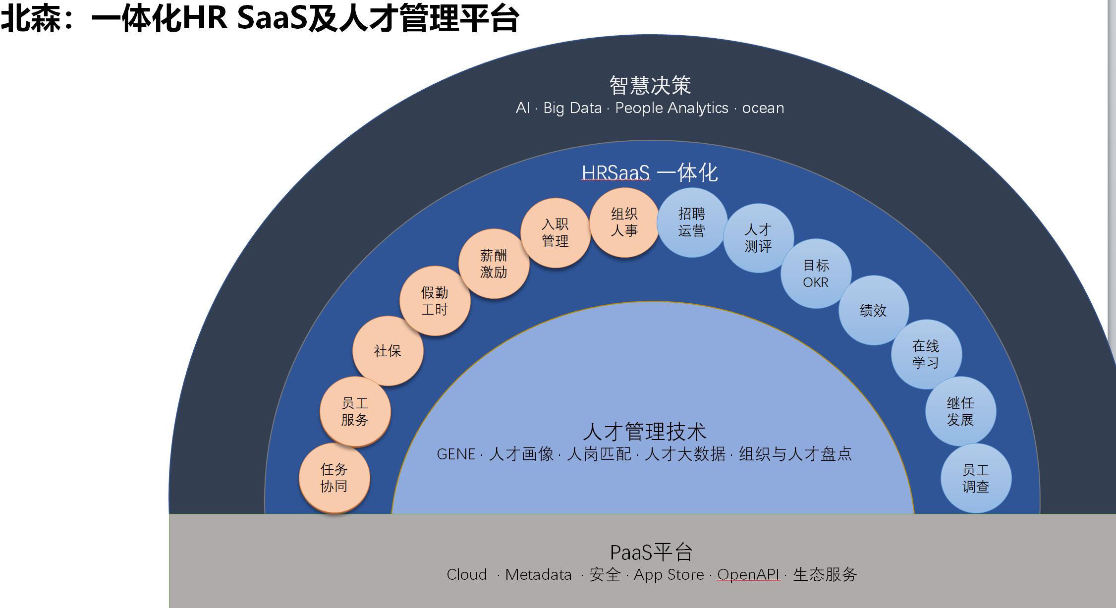 最后介绍一下北森,北森是一体化的HR SaaS人才管理平台,北森是一个可信任的PaaS平台,它是基于源数据和开放API的平台。这个平台基础上,北森和大部分的安装软件不同,融入了很多人才管理的制度,像人才的能力模型、人才的评估,以及过去十几年北森积累的数千万基于中国人能力的数据。在人才能力技术的基础上,我们构建EHR,就是传统HR软件,以及聘、绩效管理、人才管理系统,是一体化的HR SaaS软件和应用。