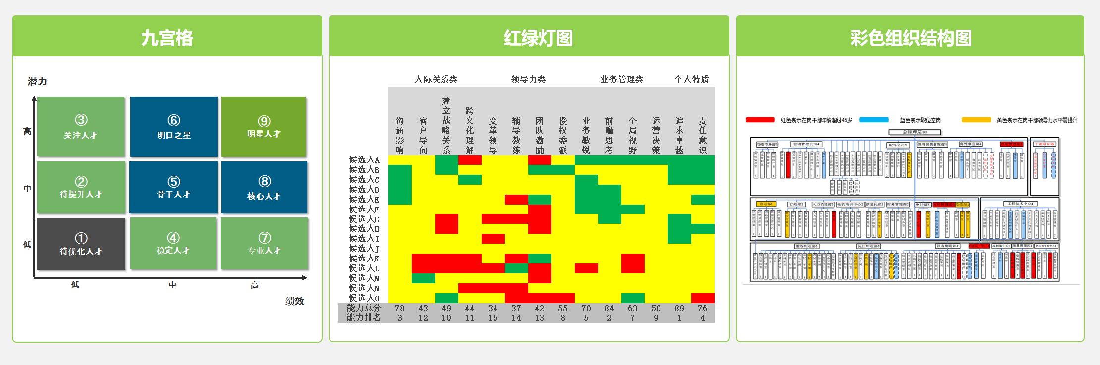 除了人才盘点,我们还有其他工具。比如,图中左边的九宫格,以此加速培养高绩效、高潜力的明星人才。对于公司中关键能力有缺陷的地方如何加速培养?右边组织结构图我们看到哪些岗位是有风险的?哪些岗位是无风险的?哪些岗位是有良好继任候选人的?通过这些工具,你就能建立完整数字化系统、看到立体化人才的情况,包括他在公司成长的轨迹,他当前岗位的胜任状况、潜力状况、优势劣势,对他的发展建议,以及多久能够晋升、多久能够胜任下一个岗位?