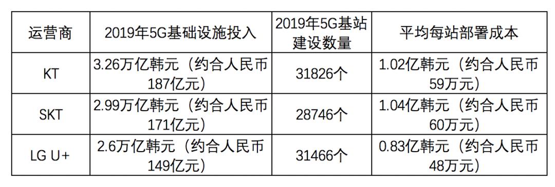 从上表看,根据韩国三大运营商2019年5G投入和建设完成的5G基站数量估算,韩国平均每个5G基站的部署成本在48万元至60万元人民币之间。