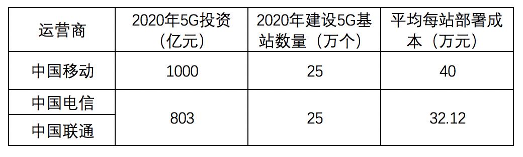 根据三大运营商的2020年5G部署计划,中国移动计划2020年建设25万个5G基站,5G相关投资约1000亿元;中国电信和中国联通同样计划2020年共建25万个5G基站,5G投资分别约为453亿元和350亿元。