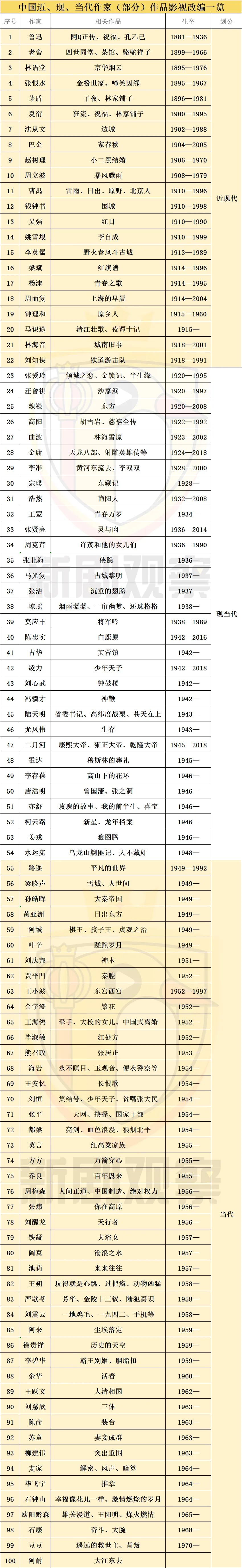 为此,新剧观察(ID:xinjuguancha)梳理了中国近、现、当代100位作家的作品影视改编情况。