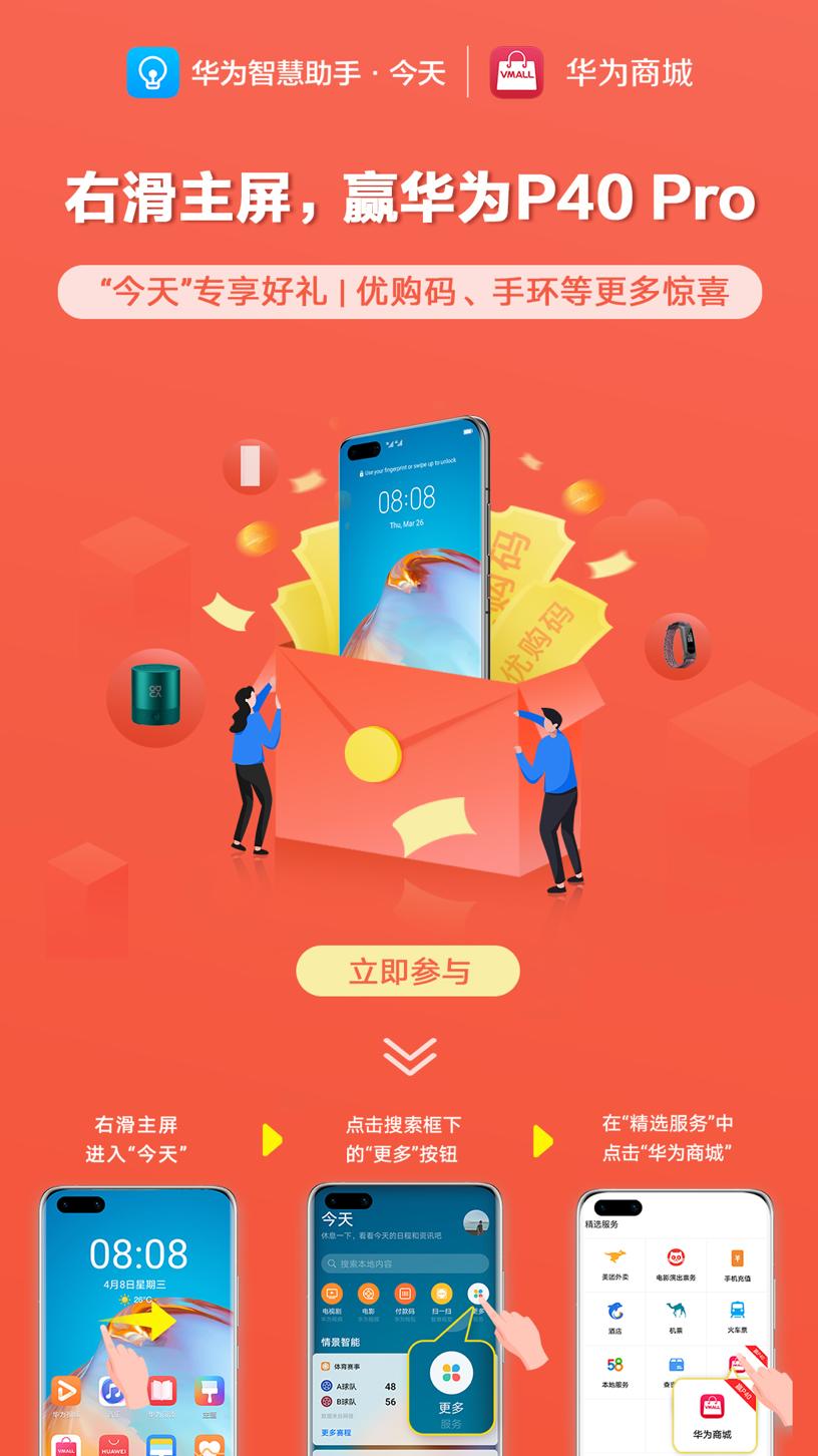 华为智慧助手·今天联手华为商城推出了“右滑主屏赢华为P40 Pro”的活动,活动从3月26日持续到4月14日。华为/荣耀手机主屏,右滑一下,进入华为智慧助手·今天,点击“更多”>“精选服务”>“华为商城”进入活动页面,参与抽奖活动,每天每个账号可抽奖3次。除了华为P40 Pro手机外,还有机会获得华为P40 Pro优购码、华为mini蓝牙音箱、华为手环等专属好礼。