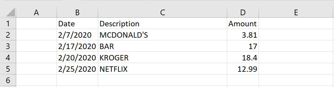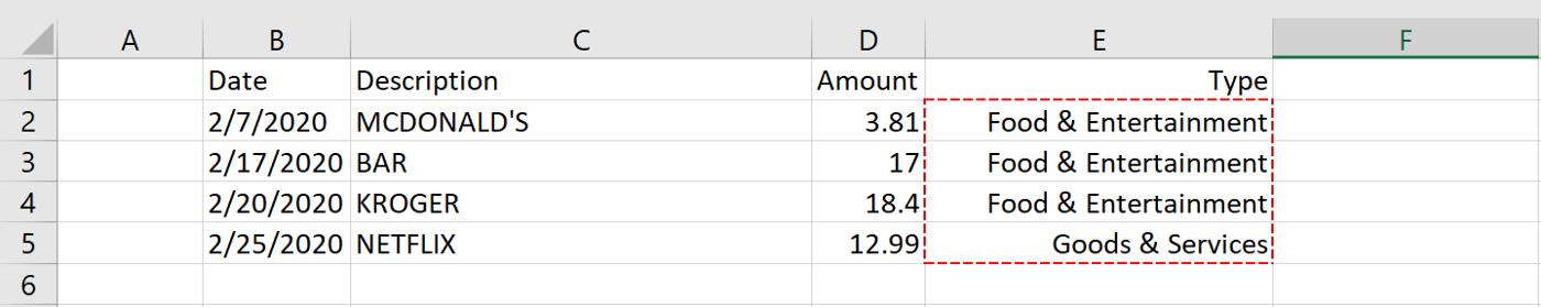 把每一个交易活动粘贴到Excel中(使用CSV格式),将每一笔支出进行分类。下面列举了五个标准的支出分类标签,当然高阶选手也可以根据自己的需要来做具体的分类(例如,“食品和娱乐”可以分成两个大类)。