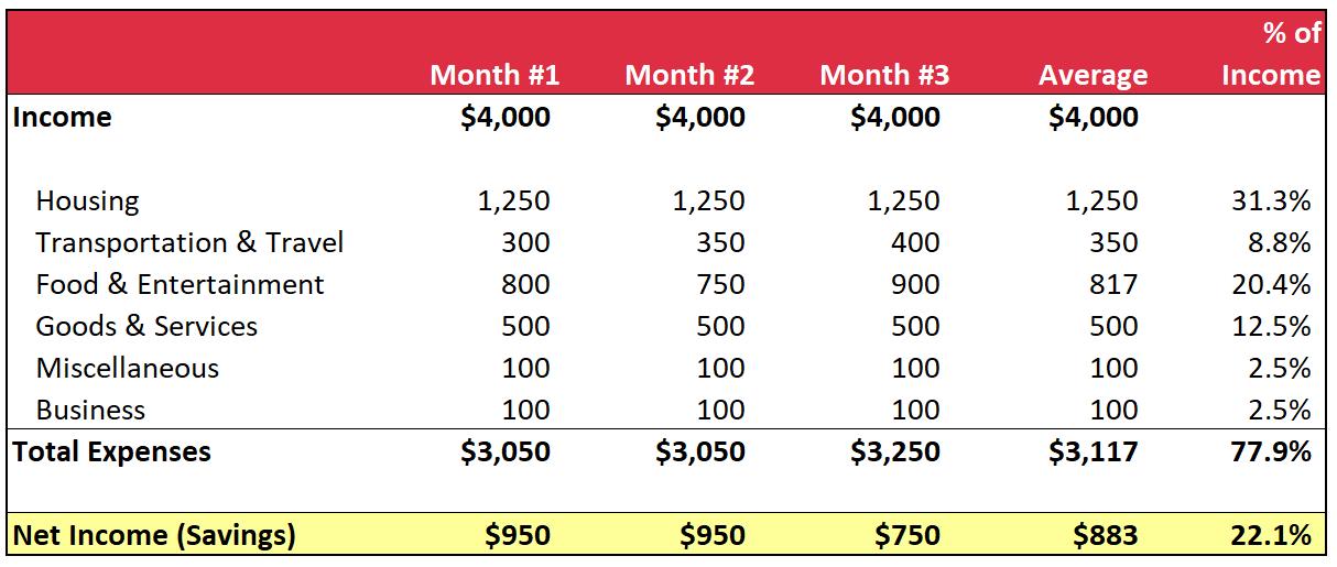 使用百分比后,你会得到如下图的表格,它是三个月预算表的一个例子。(一个解释:因为是为了计算出自己能储蓄多少钱,所以这张表格涵盖了业务支出。)
