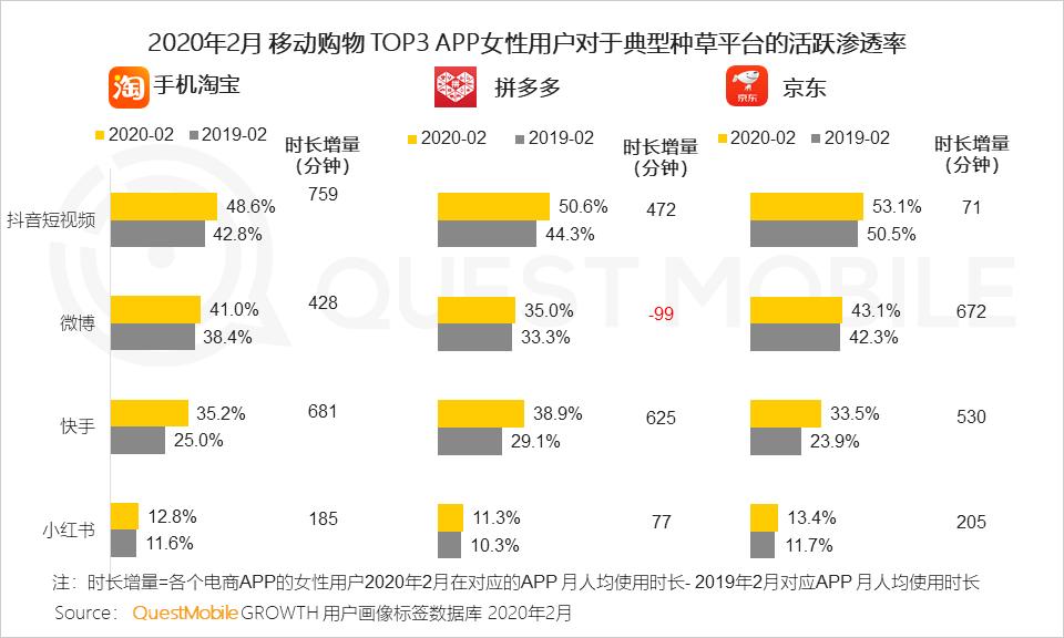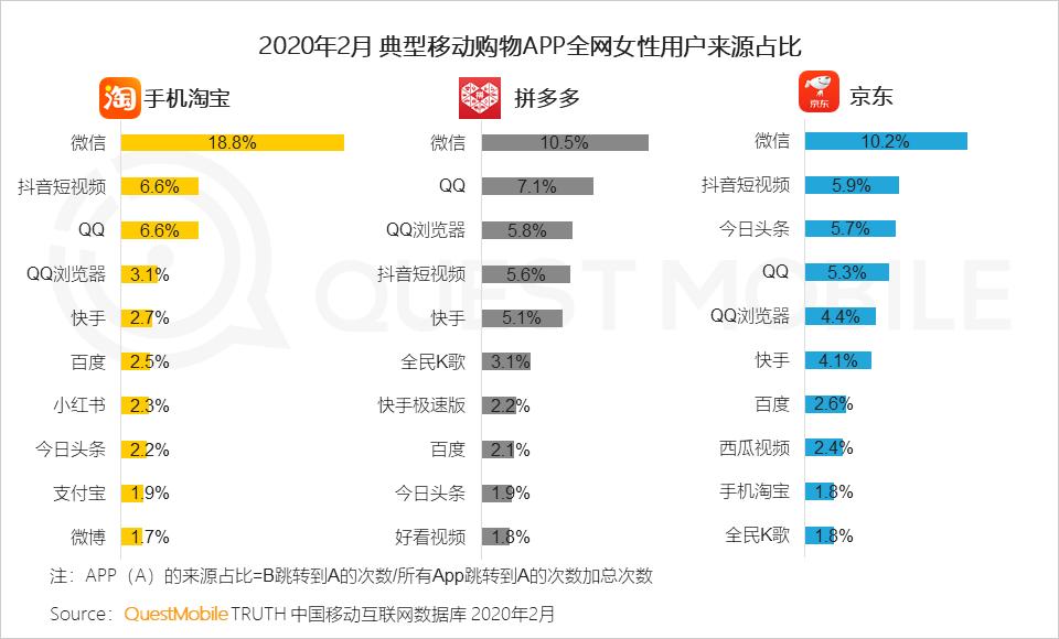 5、微信好友推荐,或者在抖音、快手、小红书中被种草,再去电商平台下单购买,成为很多女性典型购物模式,手机淘宝、拼多多、京东的女性用户中,来源于社交、短视频等平台的比例非常高