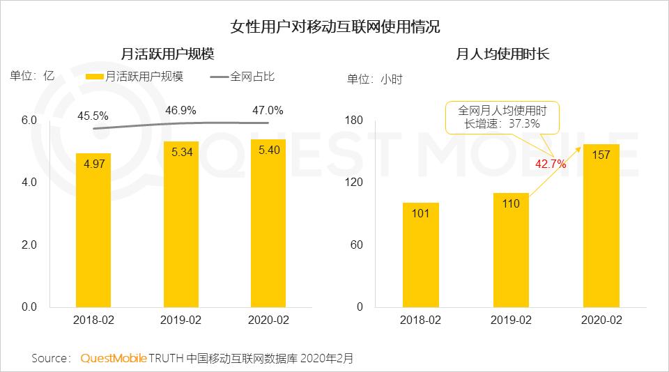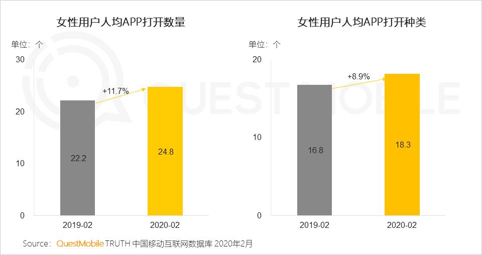 今天Mr.QM就带大家看看女性同胞们是怎么贡献的。QuestMobile数据显示,2020年2月疫情期间,女性用户规模虽然涨幅不大(保持在5.4亿左右),但是,月人均使用时长同比增长了42.7%,大大拉高了全网用户时长均值,同时,女性用户打开的APP数量也从22个增加到了近25个!