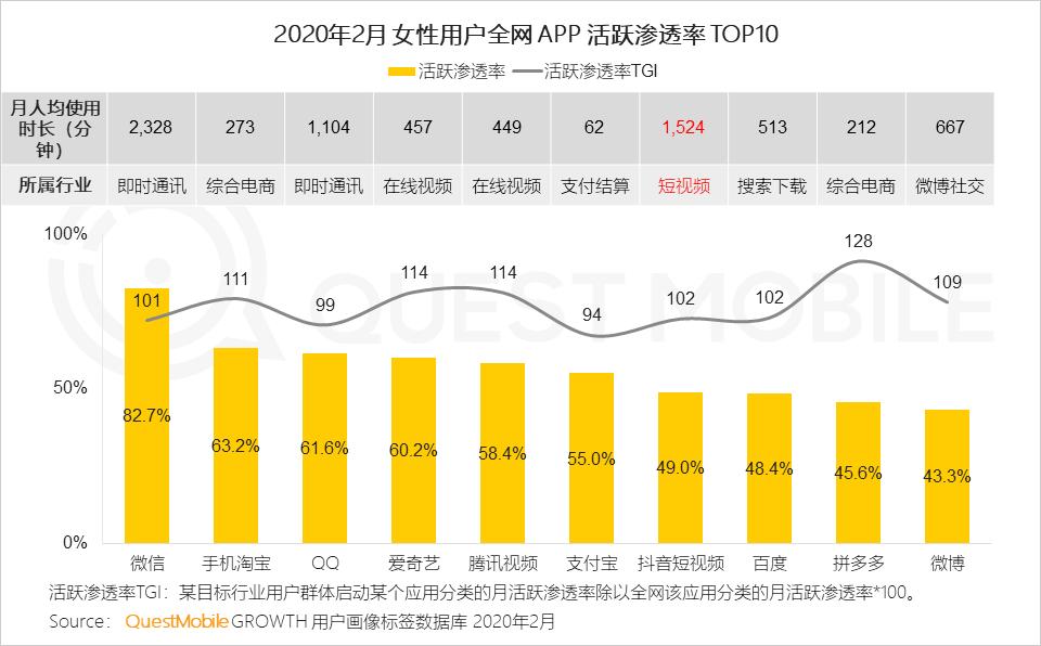 5、女性用户最常用的APP集中在社交、视频、电商领域,其中,女性对于短视频的兴趣非常突出,用于刷抖音的时长仅次于微信