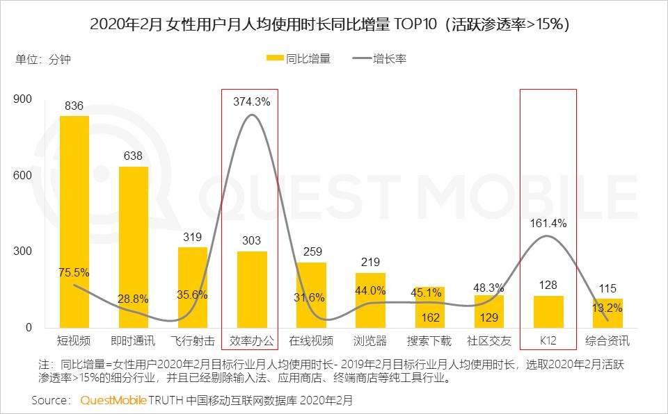 从领域渗透上看,短视频、综合资讯用户渗透率增加均超过9个百分点。从细分行业月人均使用时长增长率来看,由于疫情因素,效率办公、K12分别激增374%、161%,心疼那些一边在家工作一边还要陪娃上网课的老母亲。