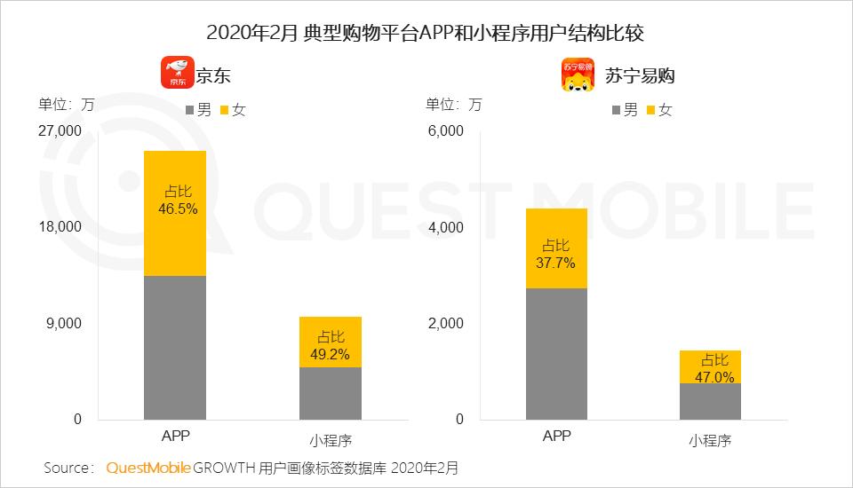 6.3 以男性用户为主的京东、苏宁易购通过拼购、社交裂变等玩法,吸引了较多女性,其微信小程序女性用户占比均高于APP