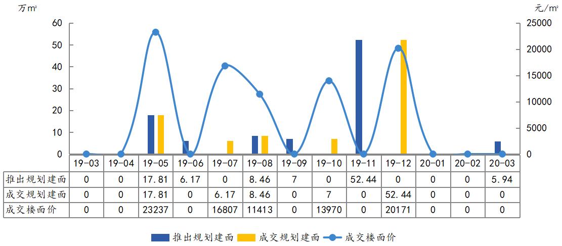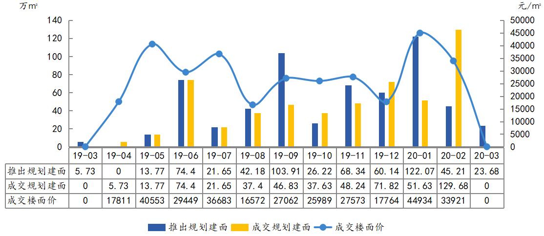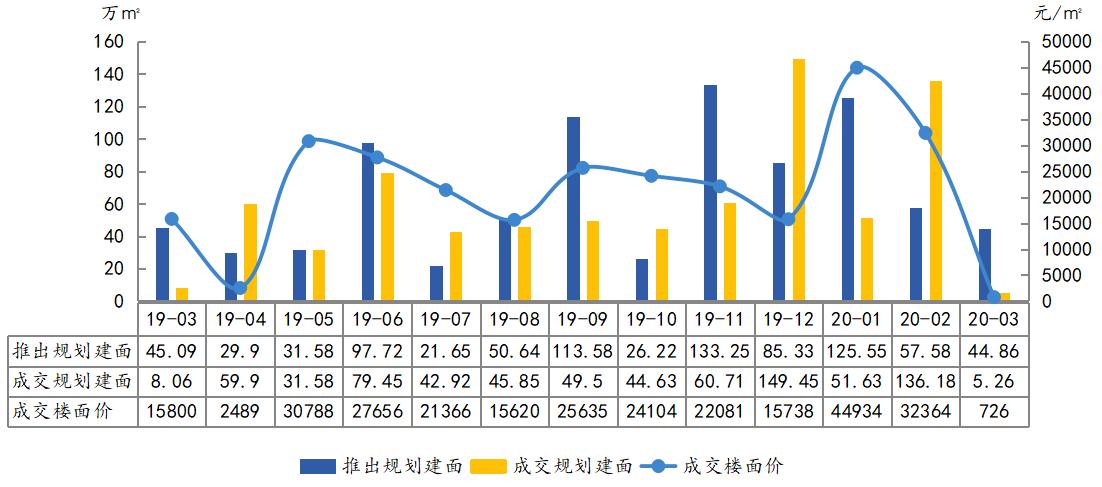 2020年1-3月,北京市共推出土地规划建面190.96万㎡,成交181.31万㎡,成交楼面均价37057元/㎡。2020年3月,共推出土地规划建面23.68万㎡,无成交土地。