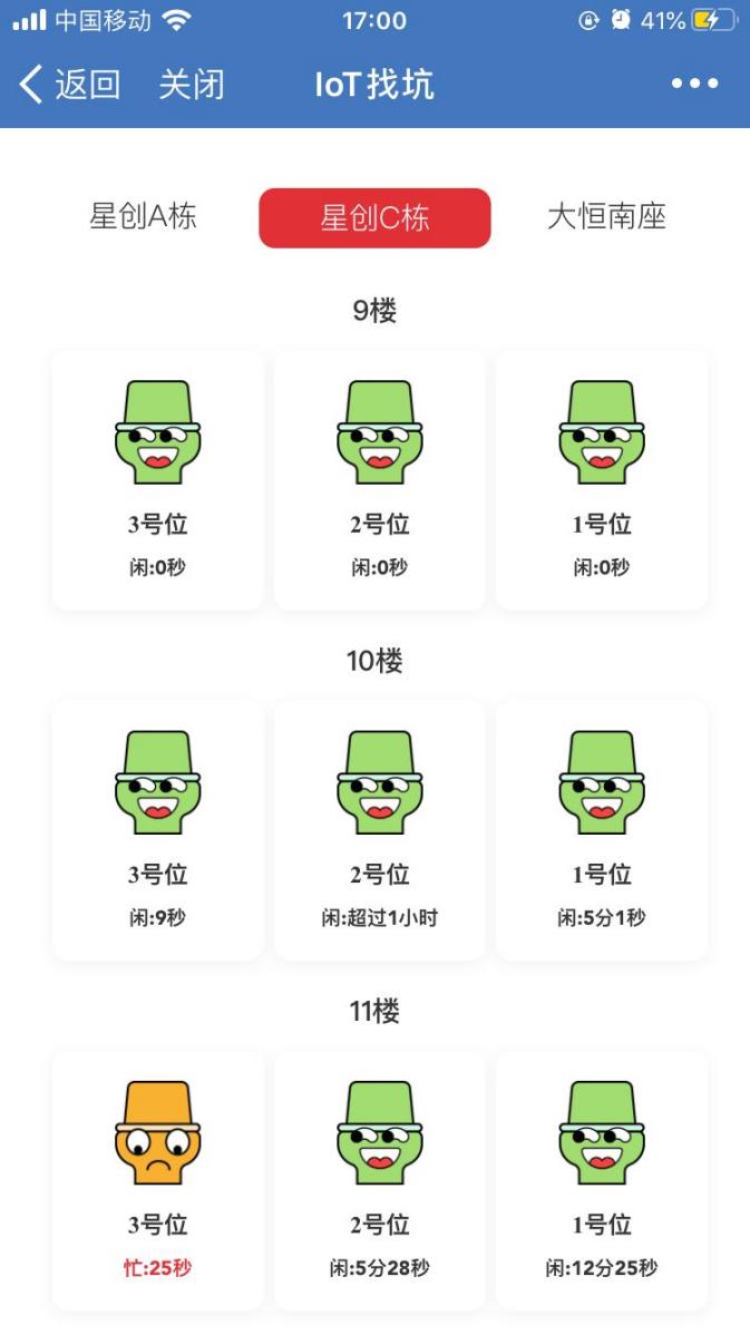 这是一个厕所坑位占用可视化的小程序,员工在手机上就能即时查看哪个坑位正在被使用,哪个坑位处于闲置状态,如果有人占用厕所超过15分钟,马桶先生的头像会变成红色发怒状。