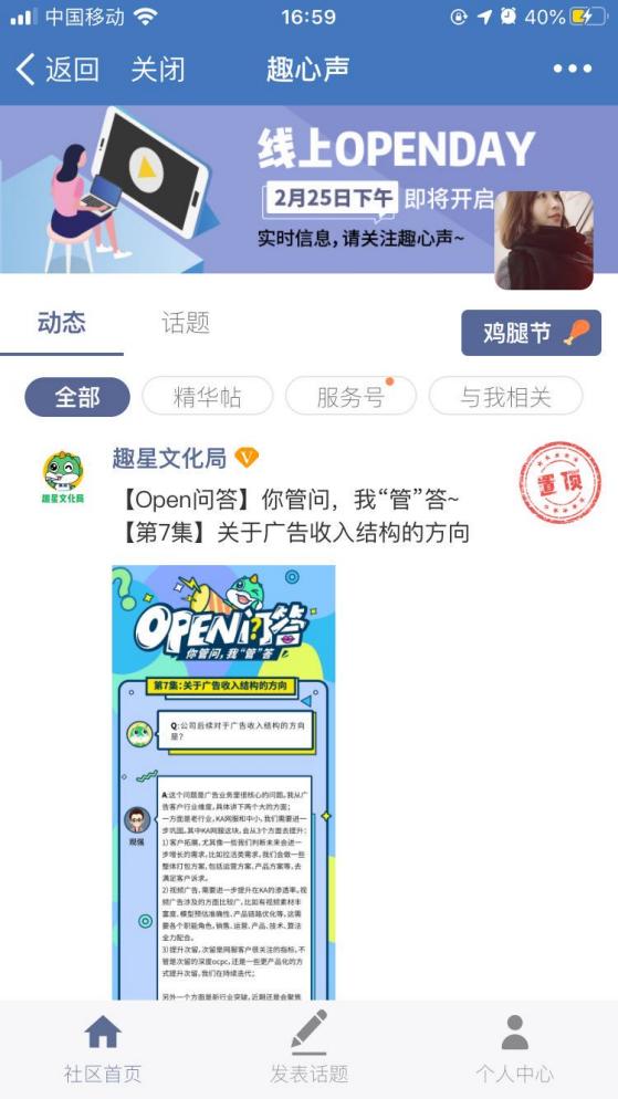 这个场合没有部门和职务之分,自行去参加的同事们大多相互并不认识,连公司创始人兼CEO谭思亮也悄悄坐在人群里,等待回应员工们上至公司战略下至个人家庭生活问题。待解的问题从趣心声论坛、视频会议和会场同事群里被提出。各个业务线负责人会站到前面公开展现所有数据,不管是增长的还是缓行的数据。
