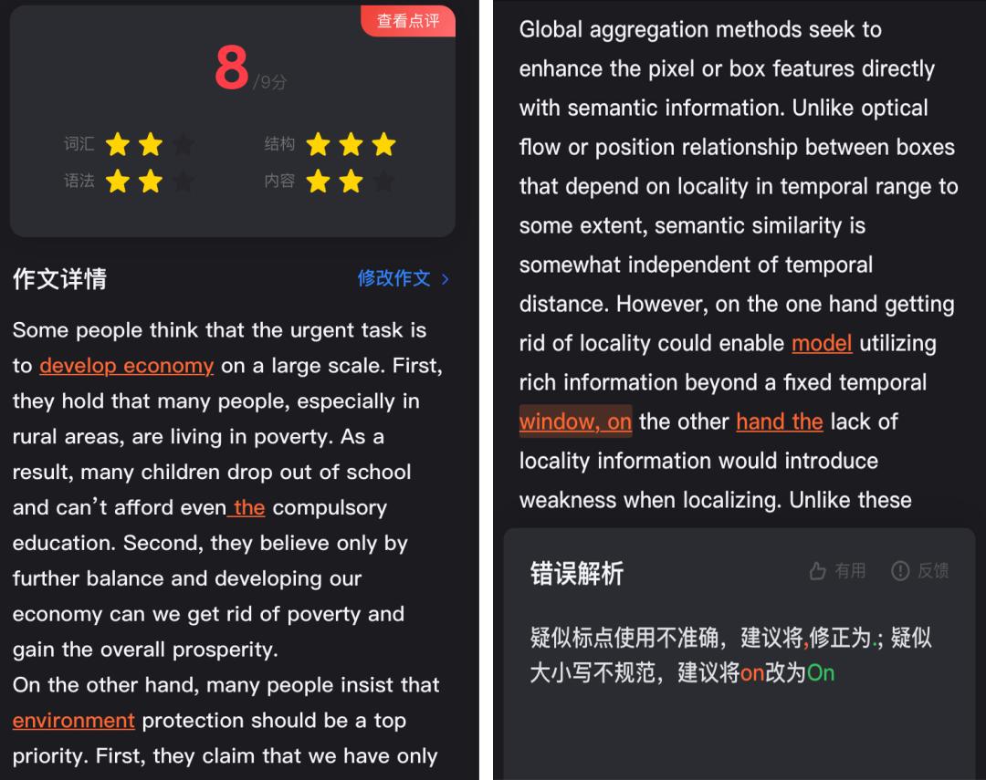 AI 作文批改功能已经放到了最新版本的有道词典 APP 中,我们先试用了一下雅思作文与 arXiv 上的论文。如下左边是雅思作文,它会给作文整体打一个分数,并通过点评告诉你哪些地方需要加强,例如词汇的丰富度、逻辑的连贯性等等。对于我们比较关心的语法,AI 作文批改也会给出修改意见,例如「environment」就推荐改成「environmental」。