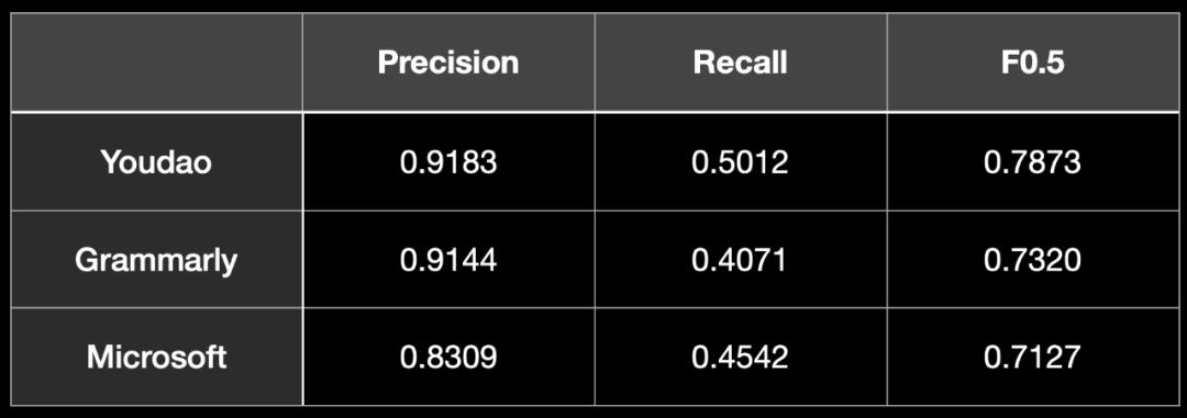 其中,Precision 是语法检测与修正的精确率,Recall 表示语法检测与修正的召回率。而 F0.5 为精度与召回率的调和平均,其值越高,通常表示算法性能越好。从上表我们可以明显的看到,有道词典 AI 作文批改的三项指标均高出同类先进自动批改软件 5%~7%。
