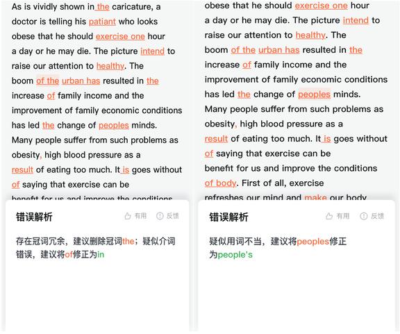 从总体体验上来说,有道词典挑出来的错误更全一些,尤其是当一句话中出现多种错误时。而且因为 AI 作文批改采用了前沿的 DL 模型,它对上下文的感知会更强一些,对于较复杂语法问题、或者语篇尺度上的时态问题,它都更有优势。
