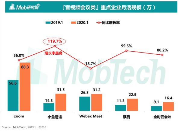 另一方面,已有的音视频会议类产品也在疫情期间迎来月活大幅增长。MobTech数据显示,2019年1月,zoom、小鱼易连、瞩目等月活规模均大幅增加,其中,小鱼易连的同比增长率最高,达119.7%。