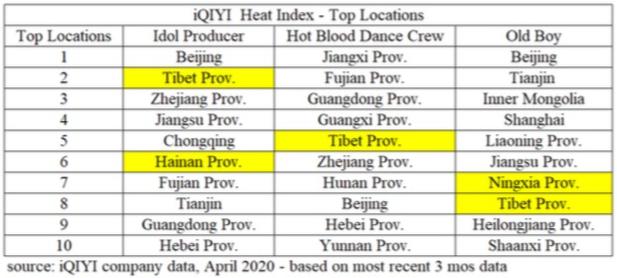 此外,报告引用了近三个月的数据,综艺节目《老男孩》、《偶像练习生》、《热血街舞团》用户热度值前十名中,都出现了人口稀少的西藏、海南、宁夏。其中,《偶像练习生》来自西藏的观众热度值位居第二,仅次于北京,超越浙江。报告认为,这明显违背人口分布和当地的语言文化特点。