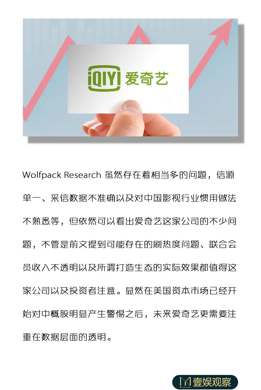 Wolfpack Research的报告或许最终无法到达他们想到的目的,但通过这份报告本身依然可以看出爱奇艺这家公司的不少问题,不管是前文提到可能存在的刷热度问题、联合会员收入不透明以及所谓打造生态的实际效果都值得这家公司以及投资者注意。显然在美国资本市场已经开始对中概股明显产生警惕之后,未来爱奇艺更需要注重在数据层面的透明。