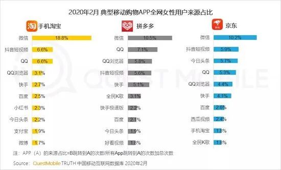 具体来看,手机淘宝来自微信的女性占到18.8%,来自抖音、QQ的女性用户均为6.6%;拼多多则来自微信、QQ的女性用户较多,分别为10.5%、7.1%;京东女性用户10.2%来自微信,5.9%来自抖音。