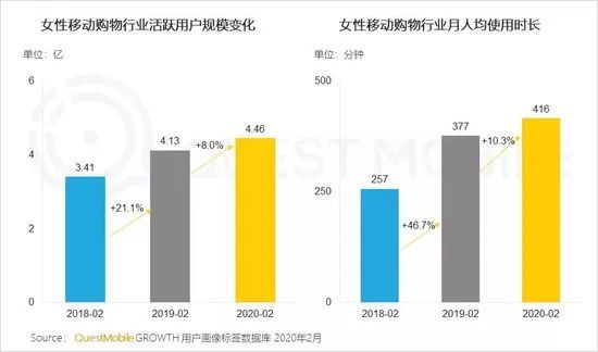 4月8日消息,Quest Mobile发布《女性新消费趋势报告》,称女性用户已成电商主力军。报告数据显示,电商领域女性用户规模已经增长至4.46亿,同比增长8.0%,月度人均使用时长416分钟,同比增长10.3%。