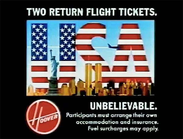 在一项新的促销活动中,同样购买单价100英镑的Hoover产品可为英国客户获得两张往返纽约或奥兰多的机票,价值超过600英镑(相当于现在的1,200英镑)。