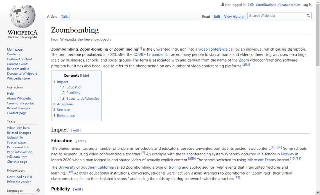 Zoom 在近期由安全漏洞,造成的一系列影响,已经被欧美网友形容为 Zoombombing 现象,并且已经为这个词创造了维基百科页面。