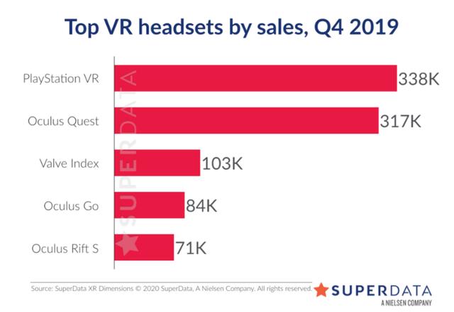 而HTC的vive目前在市场占有上遭受Oculus和VALVE的夹击,似乎不容乐观,经过手机业务失败的HTC也和雅达利和任天堂一样将宝押在一个新兴技术上,让人们不禁感慨,天下大势分久必合合久必分,历史总是惊人的相似,根据尼尔森旗下Superdata发布的报告显示,HTC因为没有公布销量而未上榜。