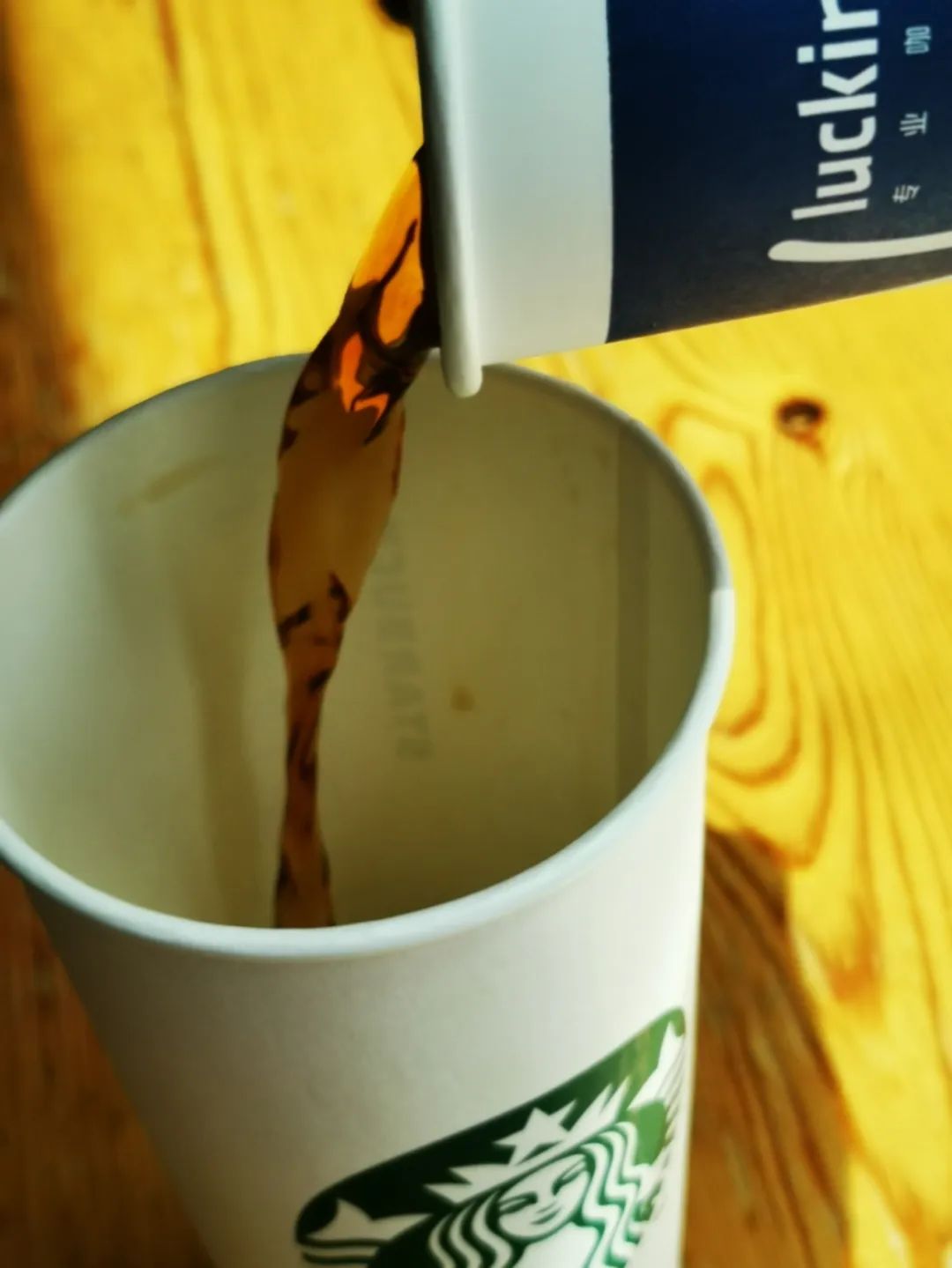 第二天下班时,先到瑞幸买杯美式,然后再到星巴克,跟店员要了杯热水,这样就有了星巴克杯子。