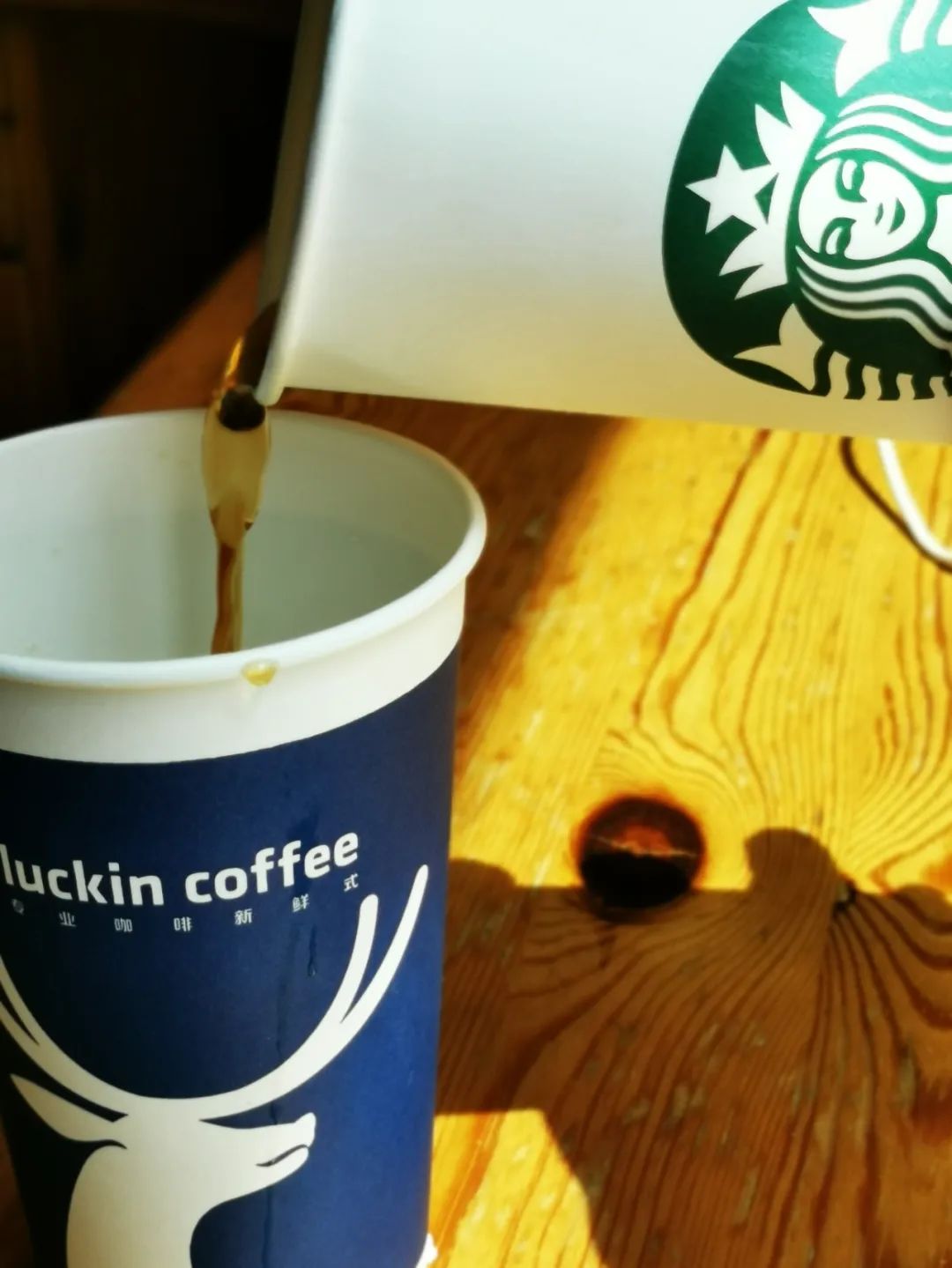 第三天下班时,先到瑞幸要了杯开水,拿到瑞幸杯子,然后再到星巴克买了杯美式。