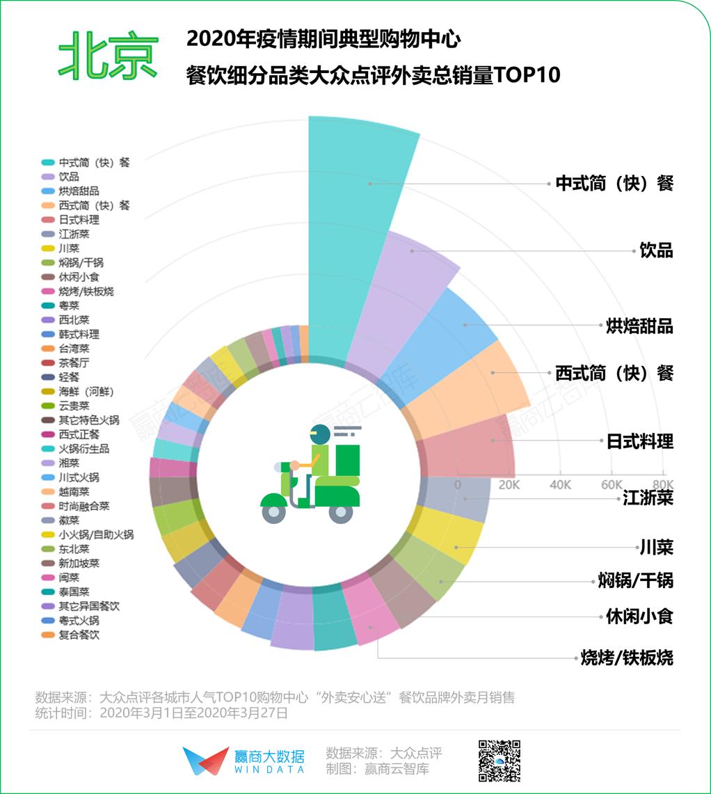 休闲餐饮、日料需求明显:疫情期间,北京消费者对休闲餐饮(饮品、烘培甜品、休闲小食)的需求尤为显著;此外,日料的外卖总销量在8城中居首位,以寿司、拉面等健康简餐热度较高。