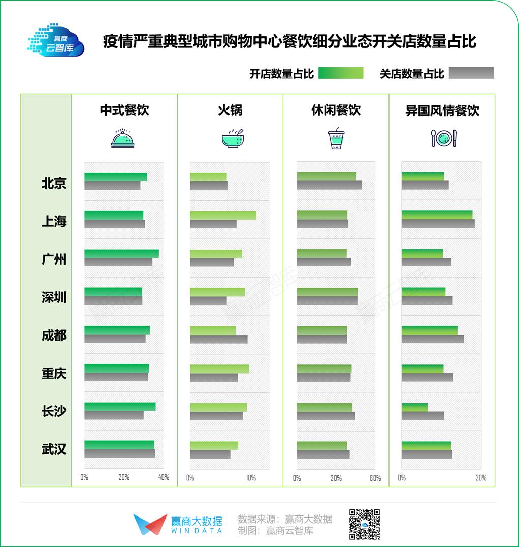 赢商云智库统计疫情较严重且具有商业代表性的8个头部城市(北京、上海、广州、深圳、成都、重庆、长沙、武汉)502家购物中心(商业面积≥5万m²)2019年开关店数据,并结合疫情期间大众点评餐饮外卖销量进行交叉分析,探究未来餐饮的“补偿性消费”增长点。
