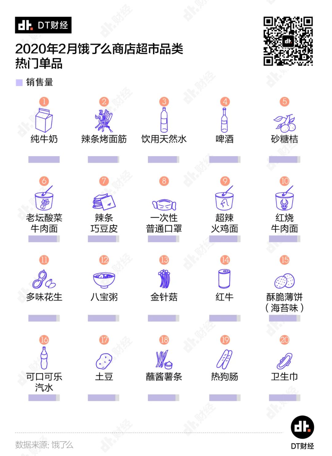 而在饿了么2月商店超市外卖的热门商品中,既有生鲜、零食和饮料,也有口罩、卫生巾等日用品。