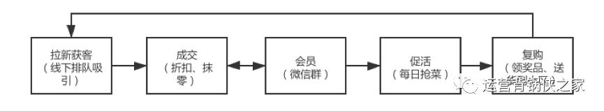 我们来提取关键信息分析,菜店老板利用线上+线下穿插社群+会员营销,把菜市场其他青铜狠狠甩出几条街,关键点路径如下:
