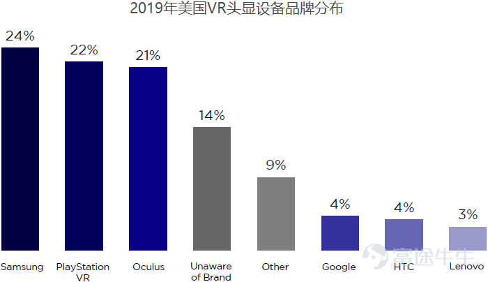 目前VR产业参与者基本为设备提供者或者为内容开发者,由于技术发展尚未成熟,因此行业里每个参与者都想让自己成为下一个行业标准的制定者,因此,行业格局多为科技巨头收购相关研发公司,硬件软件双线推进为主。根据Newzoo统计,2019年美国VR头显设备主要来自于三星、索尼以及Facebook旗下的Oculus,还有谷歌等其他厂商。
