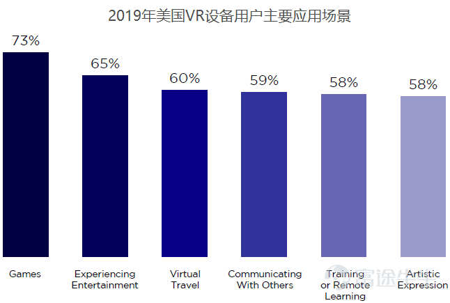 根据Newzoo调查统计,2019年美国VR设备用户主要的应用场景在于游戏、娱乐,这点很符合新技术诞生流行的特点——满足人类最基础的欲望。