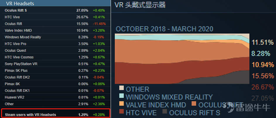 数据也反映了VR玩家数量的单薄,通过steam硬件统计,全平台拥有VR设备的用户仅有1.29%,其中大部分是Oculus Rift以及HTC Vive,占VR设备的份额分别为27.05%和26.67%,而V社自己的Index也只有10.94%。