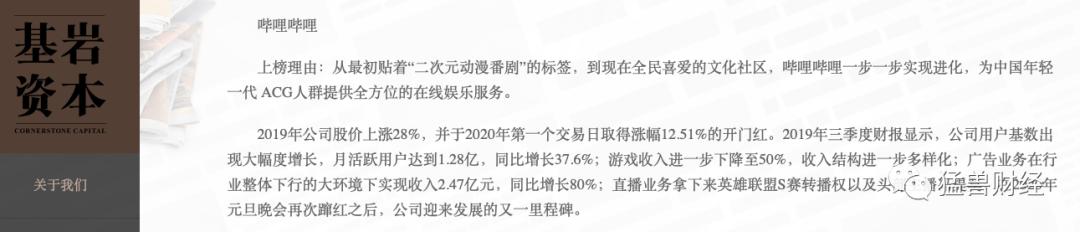 目前查不到关于基岩资本这只QD基金更多投资标的、基金净值的信息,但基岩资本的确曾经对B战“情有独钟”,比如据基岩资本官方信息,其把B站列入“2019年美国中概股影响力榜单”,同时列入榜单的有瑞幸、跟谁学、好未来等中概股公司。