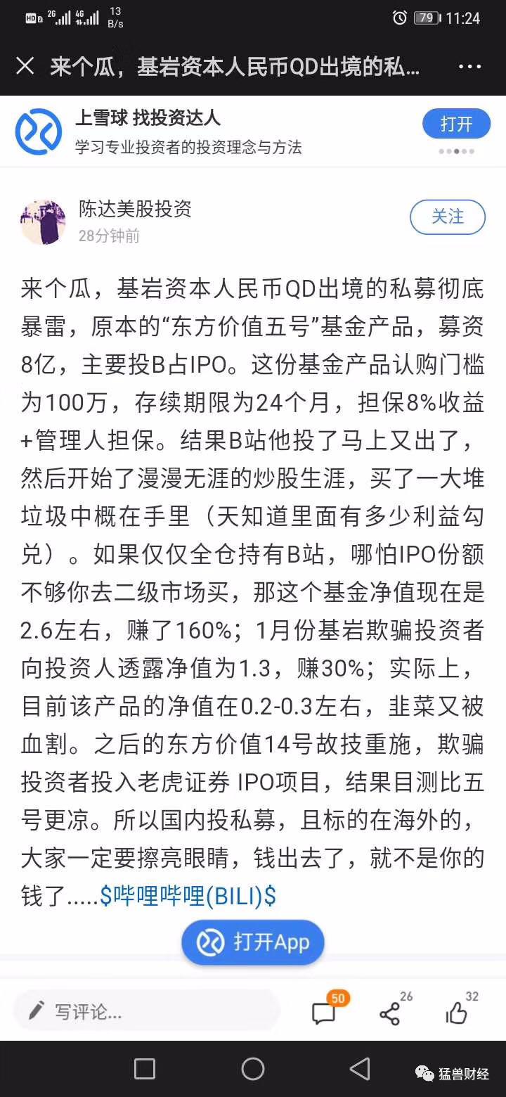 今日,“基岩资本人民币QD出境的私募彻底暴雷 “的截图从雪球网流传出来。博主“陈达美股投资”发帖称,基岩资本人民币QD出境私募基金彻底暴雷,原本的”东方价值5号”基金产品,募资8亿,主要投向为B站IPO项目,向投资者承诺担保8%的年化收益,但基岩资本并没有把资金投入到中概股B站,而是投向其他股票标的。其中,“东方价值五号的净值没有传说中那么高,而是跌到了0.2-0.3”,一句话刺中投资者和看客心脏。